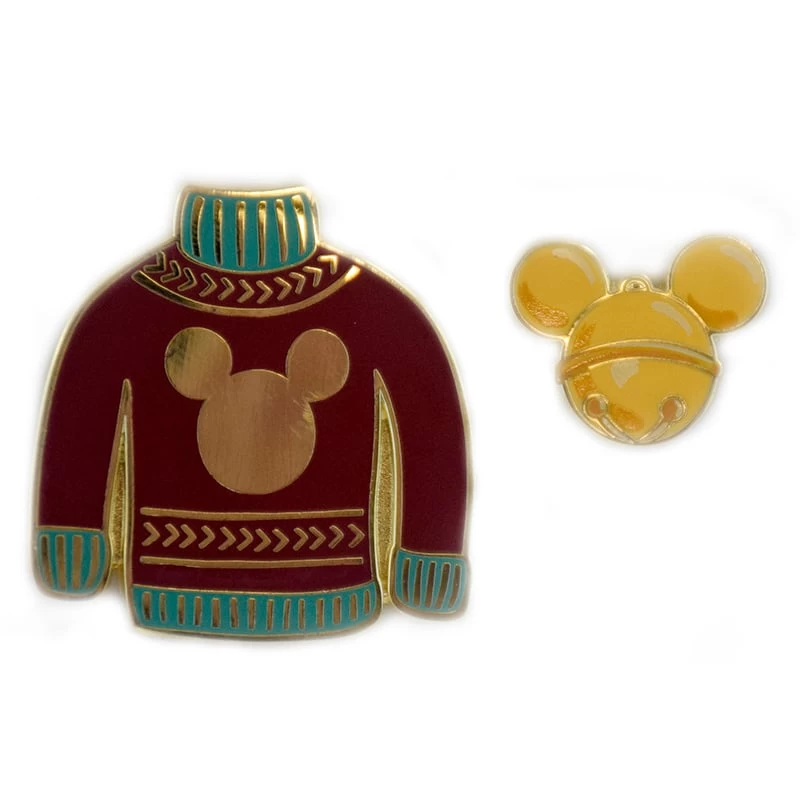 This holiday DVC pin set features two pins. One is an “Ugly Red Holiday sweater” with large Mickey Icon on it. The other is a gold Mickey Icon ornament . This is a very special pin that a must-have in any pin collection.
