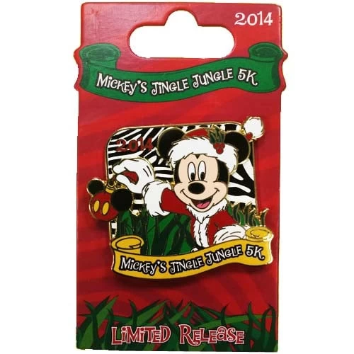 This limited release Mickey’s Jingle Jungle 5K pin features Santa Mickey Mouse decorating his tree with an awesome Mickey Mouse Ears Ornament. The background is Zebra Striped, with Tall grass, and shows the Year, 2014. A banner at the bottom of the pin says “Mickey’s Jingle Jungle 5K” in white lettering.