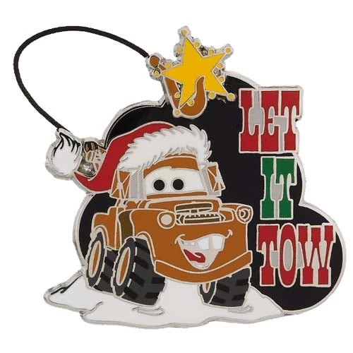 Tow Mater is surrounded by snow, wearing a Santa hat and has lassoed up the tree topper! ”Let It Snow,” Mater is ready to tow you out!