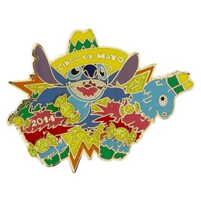Stitch is ready to party wearing a sombrero for Cinco de Mayo. Celebrate the holiday with this colorful, limited edition pin. This pin contains pin-on-pin and high concentration, glitter-fill elements.