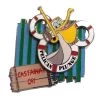 This Disney Cruise Line pin features the sun setting over Castaway Cay with one of the DCL ships in the distance.