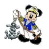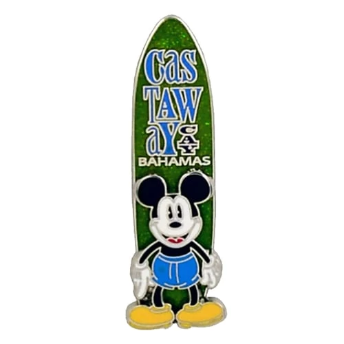Green surfboard with glitter, with a pin on pin of Mickey who has on blue shorts. Board reads “Castaway Cay Bahamas.” Back has a single post and mickey heads pattern, standard Disney pin trading logo and copyright made in China.
