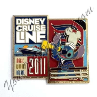 It looks like two vertical rectangular pins joined together. On the left is “DISNEY CRUISE LINE” over a DCL ship. Under the ship are the ship names – one on top of the other – MAGIC, WONDER, DREAM. Beside the names is the year 2011. On the right is a smiling Stitch wearing a white sailor hat and peering to his right through a spyglass. He, along with the ship’s railing he is holding onto, is pin-on-pin. Behind Stitch is a DCL ship’s smokestack with the DCL logo and white Mickey head icon on it.