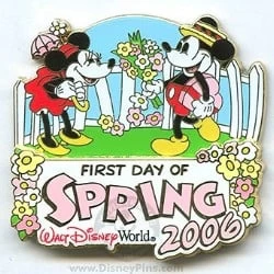 A romantic Mickey Mouse brings his sweetheart Minnie Mouse a bouquet of flowers and a box of candy to celebrate the First Day of Spring 2006. This Limited Edition pin was designed for the Walt Disney World Resort by Disney Design Group Artist Martha Widener. The “First Day of Spring 2006” banner is a pin-on-pin.