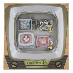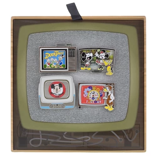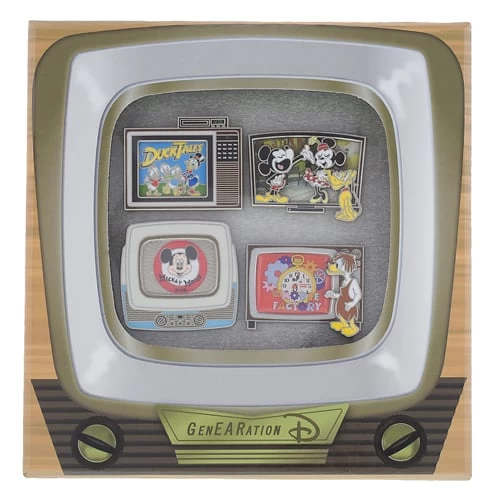 This is a Generation D Event pin set. This pin set features Disney TV through the years. The pin set is titled Disney TV Through the Years Box Set. There is a pin with Mickey Mouse Club, one with The Mouse Factory, one with DuckTales, and one with Doggone Biscuits. This pin set also features pin-on-pin elements.