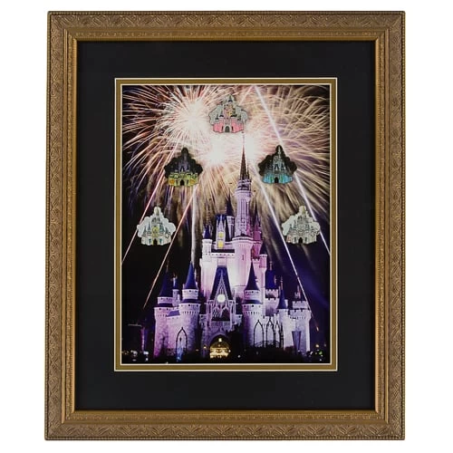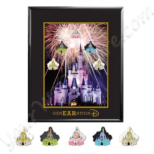 This is a Generation D Event framed pin set. This pin set features the many changes that Cinderella Castle has gone through over the years. The title of this framed pin sets is Cinderella Castle – Through the Years Framed Pin Set. There is a pin with Cinderella Castle from The Happiest Celebration event, one from Halloween, one from the 25th anniversary of Walt Disney World, one of the Holiday Ice Castle, and one of Cinderella Castle in ”normal” form. The frame may change between this picture and the release date.