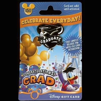 Celebrate your Graduation Day with this pin featuring the Mickey Mouse Icon Balloon with Graduate on it. The pins will be pre-fastened to a “Celebrate Everyday” themed gift card. The gift card will have a $0 balance on it. The cards can be preloaded with any amount for an additional cost. Contact us if you are interested.