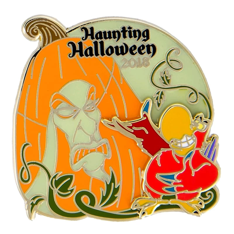 The 2018 Haunting Halloween pin series features Disney Villains as pumpkins. This is one of the 3 pins in the series and features Jafar as a pumpkin with Iago not far away.