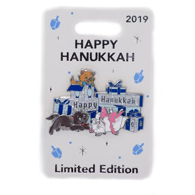 This limited edition pin features the Aristocats Marie, Berlioz, and Toulouse to help you celebrate Hanukkah 2019. “Happy Hanukkah” sparkles on the presents.