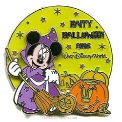 Witch Minnie sweeps through a pumpkin patch in this Walt Disney World Resort Limited Edition pin. This pin is part of the Happy Halloween 2006 Collection, and Minnie is a pin on pin.