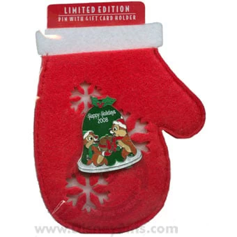 Ring in the 2008 Holiday Season with this collection of Limited Edition pins featuring the famous Disney characters. There are four (4) pins in this collection. This bell shaped pin features Dale giving Chip a holiday gift. The pin also features a specially designed backer card that can be used as a gift card holder. Monty Maldovan of the Disney Design Group created the original artwork for this pin.