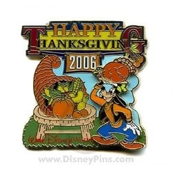Goofy carries the turkey in this Walt Disney World Resort Limited Edition pin. This pin is part of the Happy Thanksgiving 2006 Collection, and Goofy is a pin on pin.