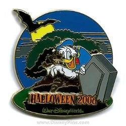 Zombie Donald is in front of the Tree of Life at Disney’s Animal Kingdom Theme Park in this Limited Edition pin. This pin is part of the Haunted Parks 2006 Collection, and Donald is a pin on pin. Art for this pin was created by Disney Design Group Artist Tyler Dumas.