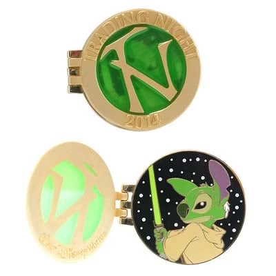 Limited edition Imagination Gala Trading Night Stitch as Yoda pin. This pin was designed by Derek Lesinski. This pin has a hinge and a stained glass feature.