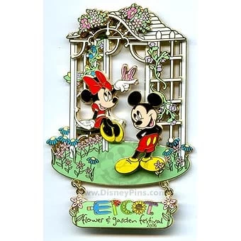 This Limited Edition Jumbo pin features Mickey and Minnie in the butterfly and flower garden. Mickey and Minnie are pins-on-pin. The dangle contains the logo for the festival. This pin was designed by Dawn Ockstadt from Disney Design Group.