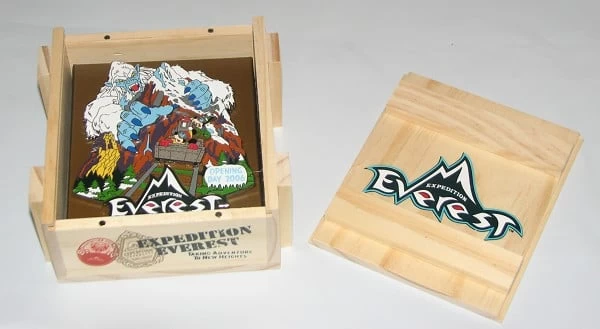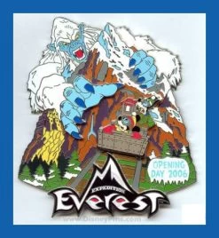 Ancient legend holds that high in the Himalayan Mountains lives an enormous creature that fiercely guards the route to Mount Everest. Celebrate the Opening Day of Expedition Everest with this Limited Edition Jumbo Pin. This pin features Mickey Mouse and Goofy narrowly escaping the yeti after their trek to Mount Everest. Their runaway train is a slider. The yeti and the Expedition Everest logo are pins-on-pin.