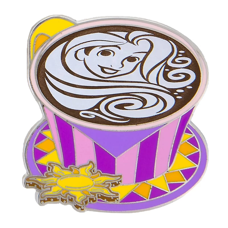 This is a pin of the month collection for 2018. It features latte’s decorated as some of the more popular Disney Characters. Each month a new pin will be released. This is the sixth pin in the series and features Rapunzel from Tangled.