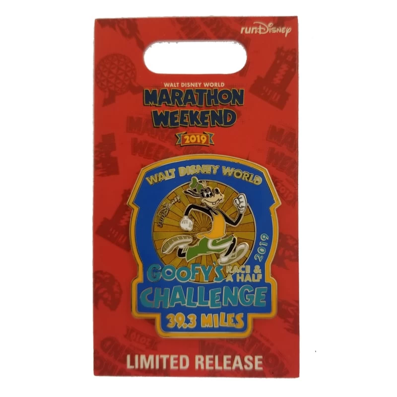 This runDisney 2019 Marathon Weekend pin is Limited Release. It features the 39.3 mile Goofy’s Race and a Half Challenge with Goofy running. A must-have for any runDisney Marathoners!