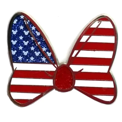 This pin features the American flag in the shape of Minnie Mouse’s bow.