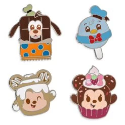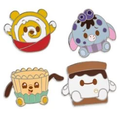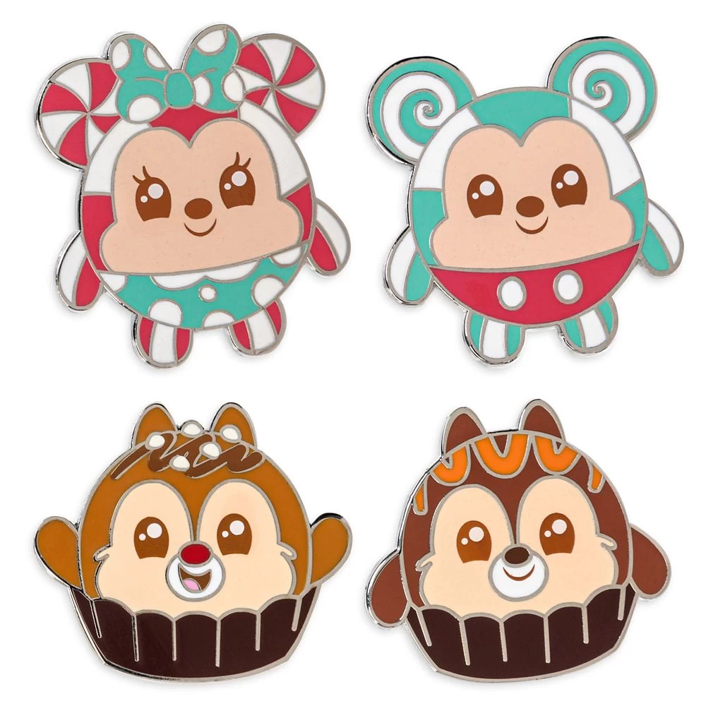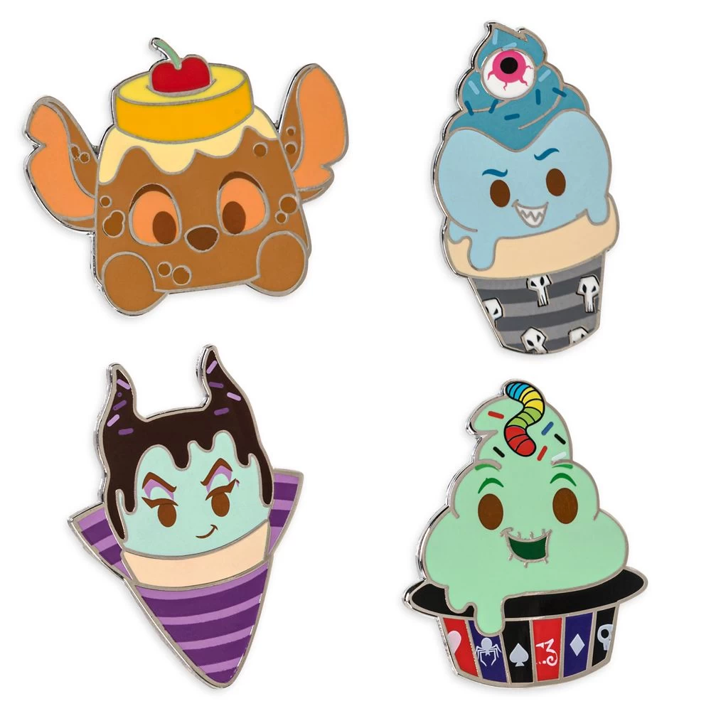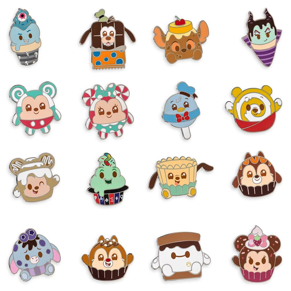 Cool Mint Candy Mickey Mouse, Cinnamon Swirl Bun Mickey Mouse, Peppermint Meringue Hard Candy Minnie Mouse, Wild Strawberry Cupcake Minnie Mouse, Peanut Butter Chocolate Swirl Cup Pluto, Cake Pop Donald Duck, Chocolate Brownie Bar Goofy, Dark Chocolate Ganache Truffle Chip, Dark Chocolate Ganache Truffle Dale, Honey Cake Winnie The Pooh, Wild Blueberry Muffin Eeyore, Pineapple Upside-Down Cake Stitch, Toasted S’more Baymax, Double Chocolate Mint Chip Cone Maleficent, Watermelon Gelato Oogie Boogie, and Blueberry Jam Ice Cream Cone Hades - Enameled cloisonné