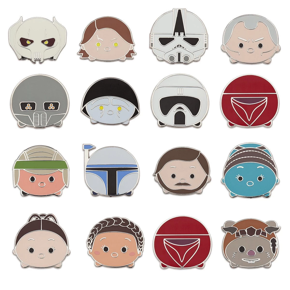 A galaxy of your favorite Star Wars characters have gone to the cute side with this ”Tsum Tsum” Series 3 Mystery Pin Pack. You will receive five (5) randomly selected pins from a possibility of 17 different designs.