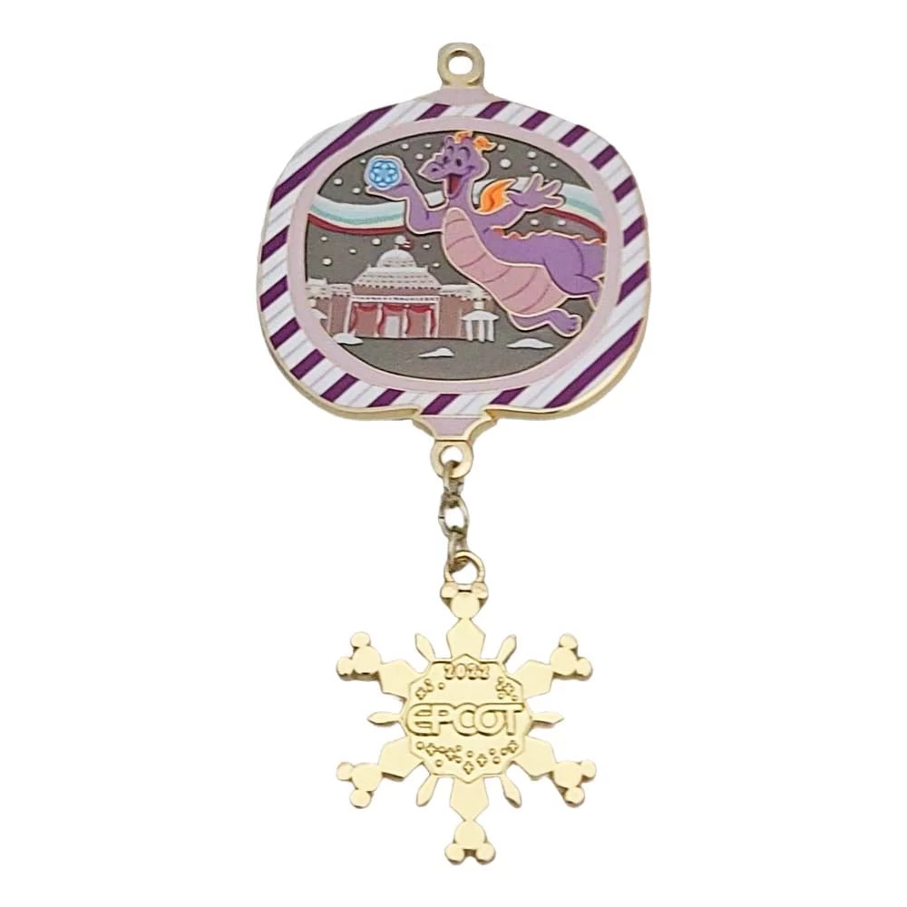 It’s a pin! It’s an ornament! It’s both! You can hang this LE 2500 pin on your tree by slipping an ornament hanger through the hole in the top of this pin which features Figment on top of a snowflake dangle with the Epcot logo.