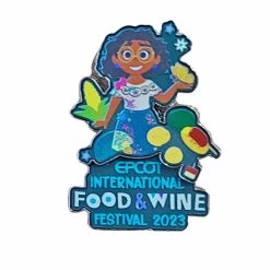 Embrace the enchanting spirit of Mirabel Madrigal with this Limited Edition Mirabel Butterfly Pin from the Epcot Food and Wine Festival! This exquisite pin features Mirabel gracefully holding a shimmering gold butterfly, accompanied by the festival logo in a design that captures her magical journey.