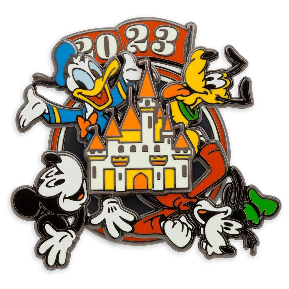 Spin into the New Year 2023 with our sparkling, spinning pin-on-pin design featuring Mickey, Donald, Goofy and Pluto encircling Fantasyland Castle!