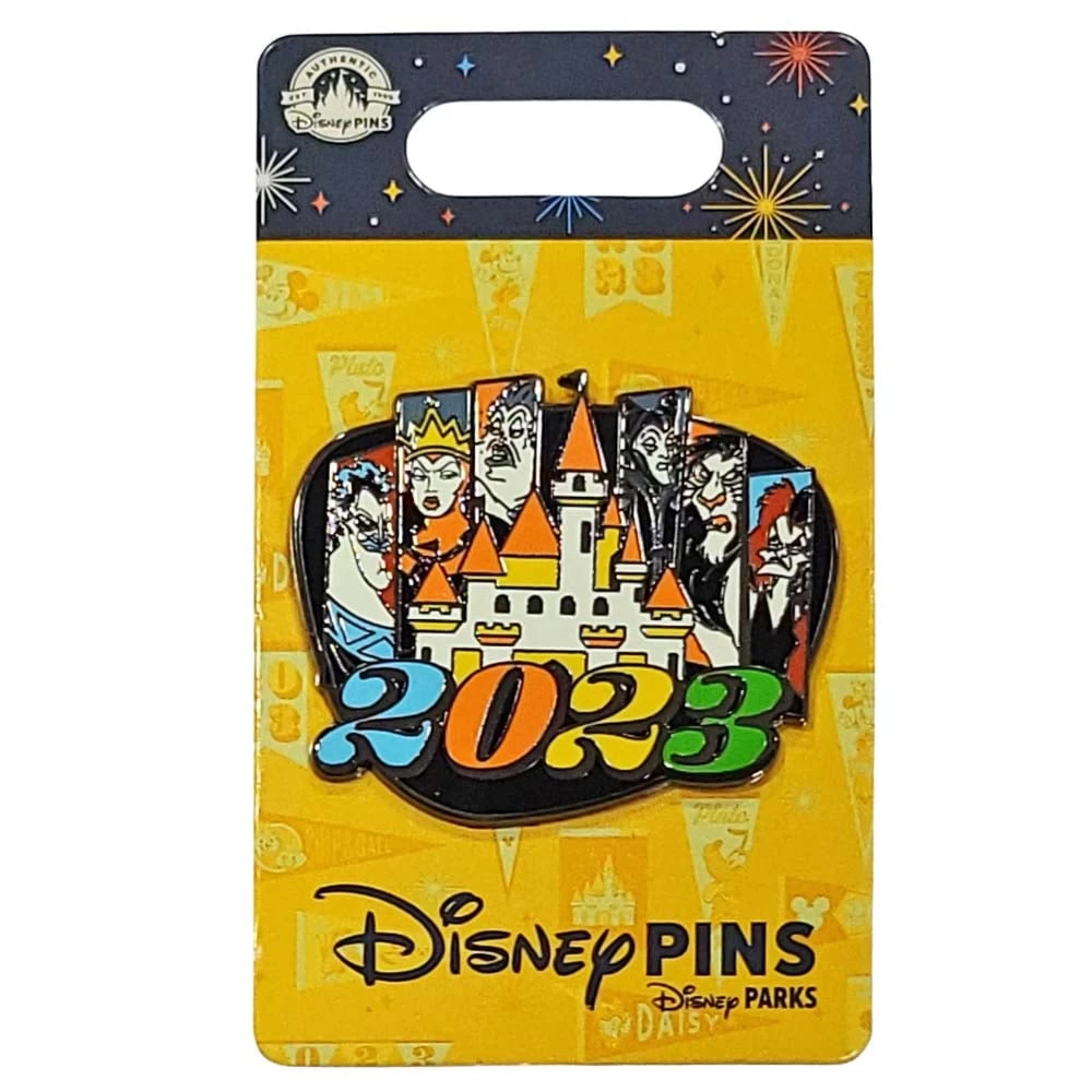 This pin features Villains on banners above a fantasyland castle with the 2023 yearly logo.