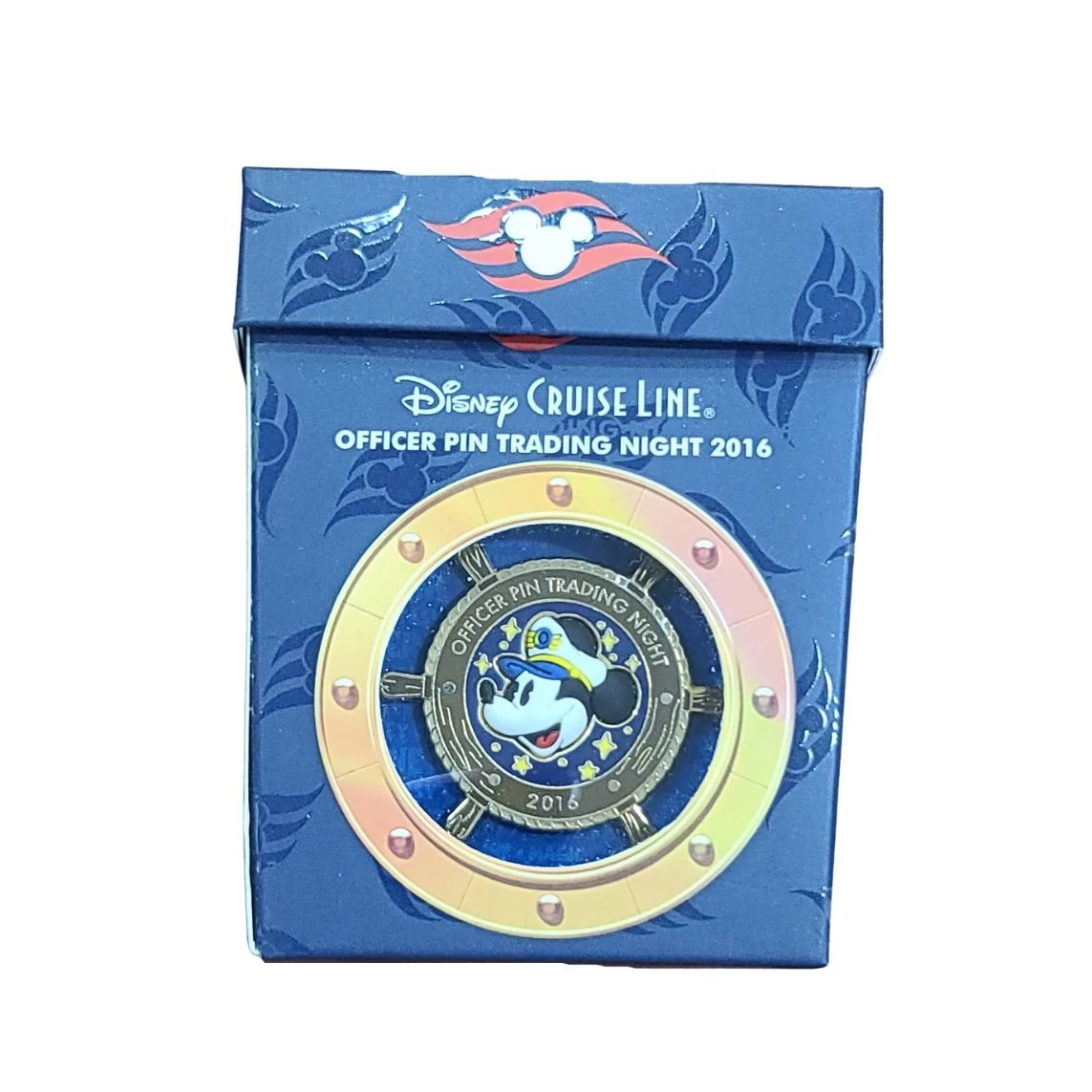 This is a pin from the Disney Cruise Line for OFFICER PIN TRADING NIGHT 2016 with Captain Mickey. This is a 3-D pin or pin on pin effect and Captain Mickey is rubberized and is in the center of the ship wheel.. Around the outer edge of the wheel it has OFFICER PIN TRADING NIGHT and on the bottom of the wheel it has 2016. It is new and in excellent condition and still in original box..