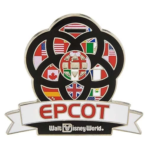 This pin features the flags of Epcot World Showcase in the Epcot emblem over the Walt Disney World logo.