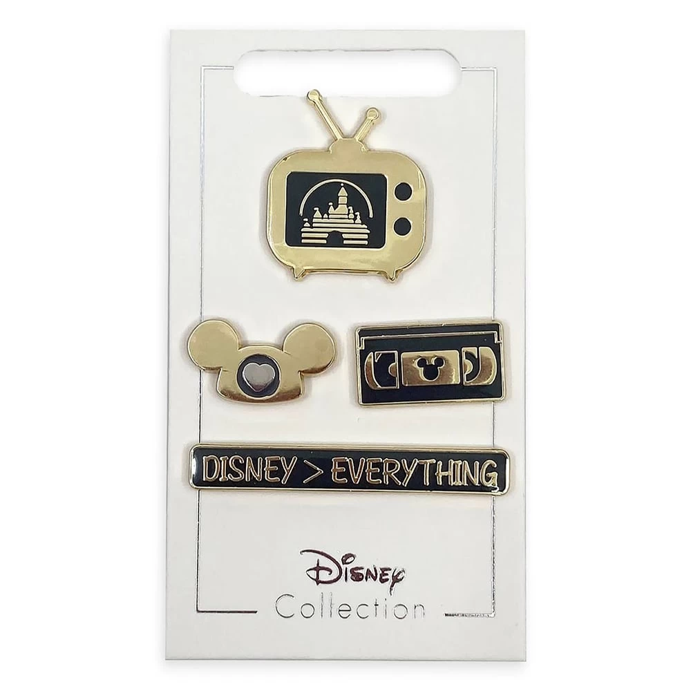 Decorate your bags, backpacks, and pin collector pages with this set of four retro Disney pin symbols, including ear hat, VHS cassette, TV set, and a ”Disney> Everything” banner.