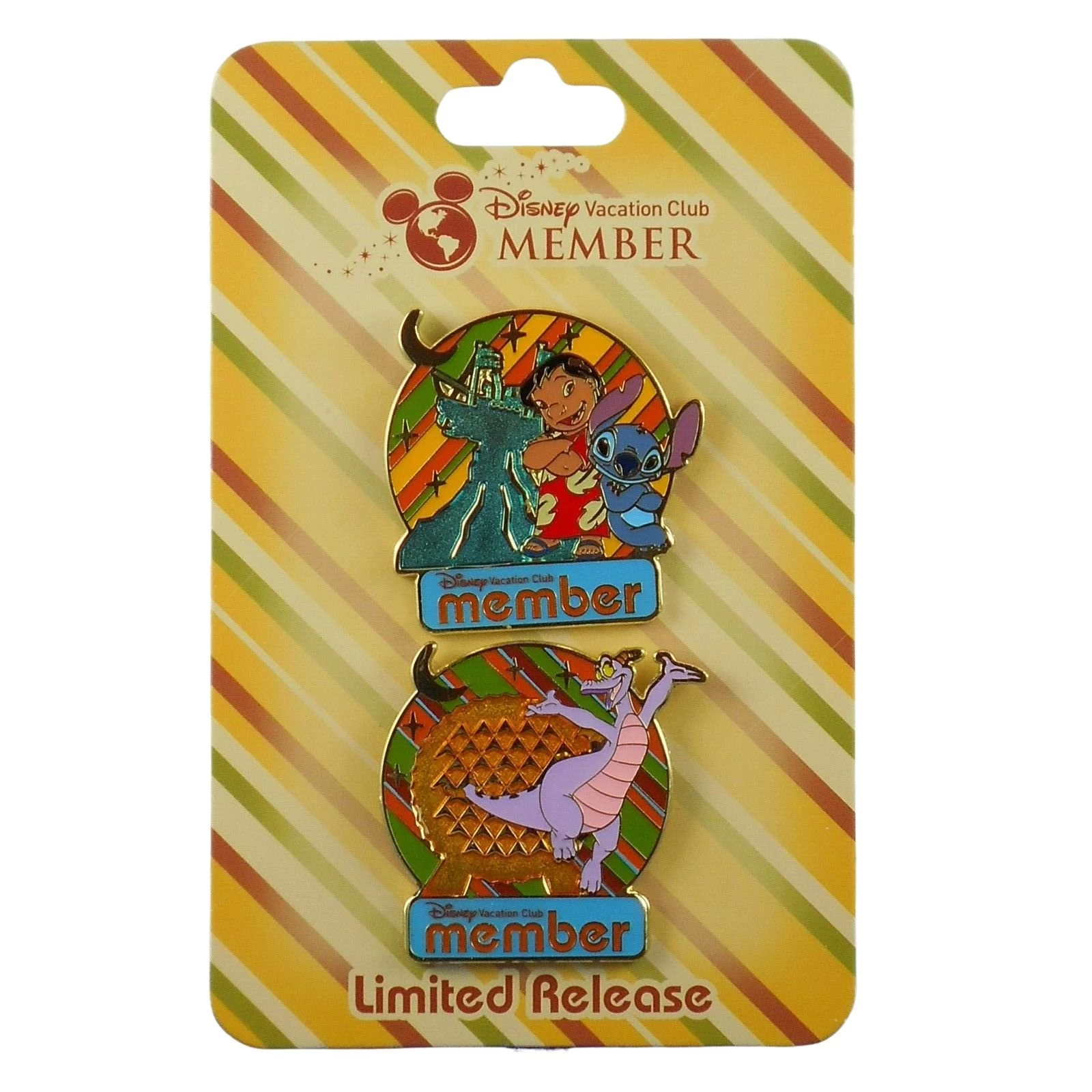 Features a volcano and Lilo and Stitch on one pin and one with Spaceship Earth and Figment