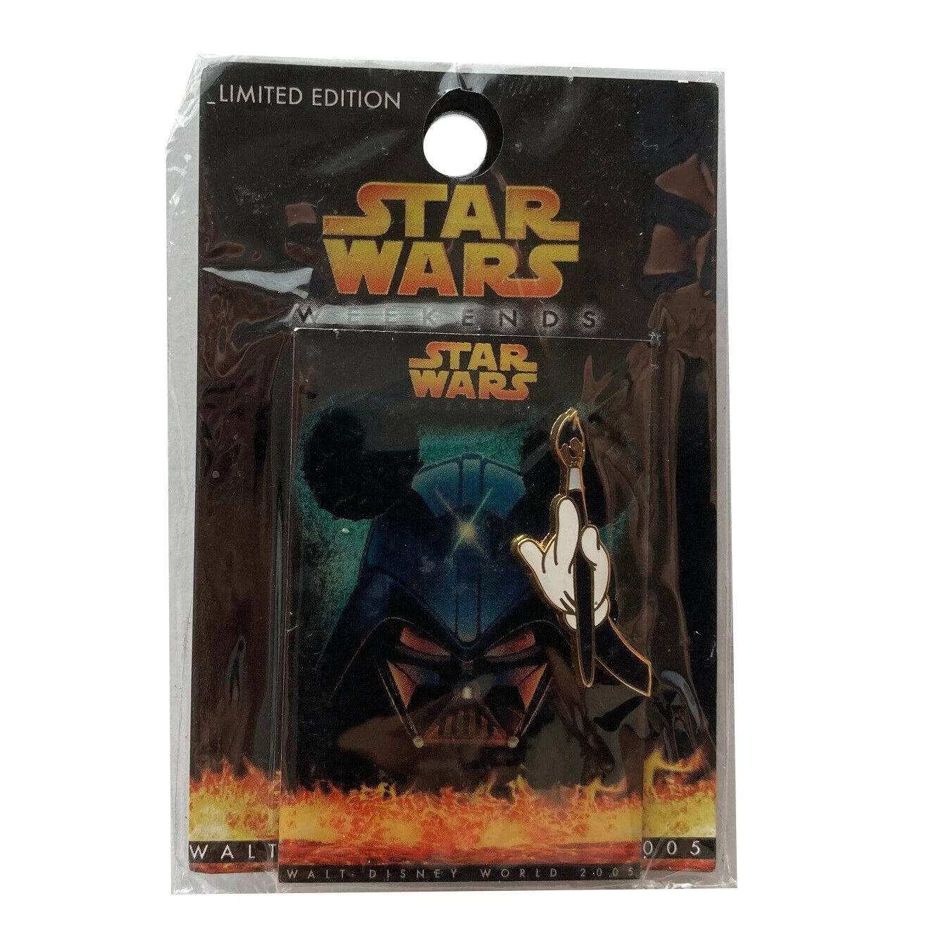 This Limited Edition pin features the logo for Star Wars Weekends 2005. Mickey Mouse is putting the finishing touches on Darth Vader’s helmet. Mickey Mouse’s hand is a pin-on-pin. Note the image of Mickey fighting with Vader reflected in the helmet. The white dot is where their two light sabers meet: Mickey is to the left and Vader is to the right. Randy Noble from Disney Design Group designed the logo for this year’s celebration. Star Wars Weekends 2005 will take place at the Disney-MGM Studios from May 20 through June 12, 2005.