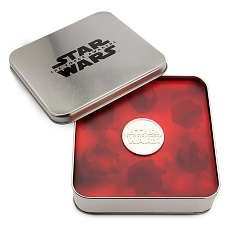 Star Wars: The Force Awakens Pin Collector Tin includes a silver-toned starter pin with the movie title and a textured background, and a display card with 6 additional spots for each pin in the collection, sold separately.