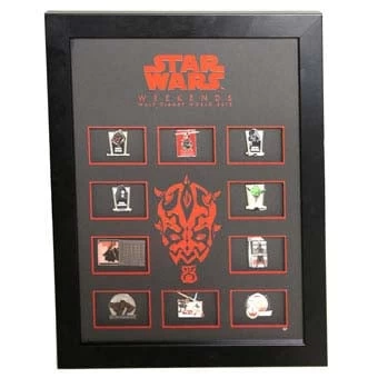 This limited release 2012 Star Wars Weekend Frame set showcases ten (10) limited edition pins. The set includes the 2012 Star Wars Weekend limited release logo pin and the frame set completer pin featuring Mickey Mouse as Aikien battling Donald Duck as Darth Maul.