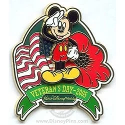 Mickey Mouse celebrates Veteran’s Day 2005 at the Walt Disney World Resort. This Limited Edition pin features Mickey as pin-on-pin. Disney Design Group Artist Mark Seppala created the artwork for this pin.